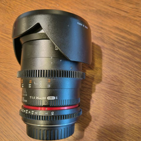 Samyangin pitempää objektiivia ja mukaan myös vastavalosuoja. Objektiivissa ei ole automaattitarkennusta vaan pelkkä manuaalinen tarkennus :)