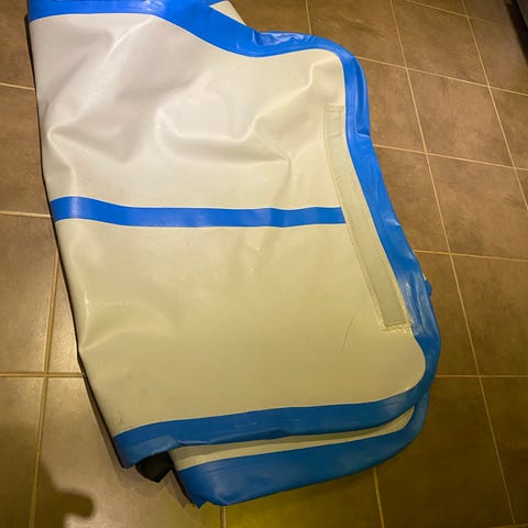 Acon Airtrack ilmatäytteinen jumppamatto, mitat 3 x 1 m. Kanto/säilytyspussista tullut harmaita jälkiä reunaan, muuten uudenveroisessa kunnossa, näistä viimeinen kuva. Ei paikattu!