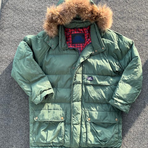 Joutsenen tummanvirheä retro untuvatakki. Koko XL tai XXL. Todella lämmin, yksityiskohtina metslliset soljet. Tosi siistissä kunnossa!