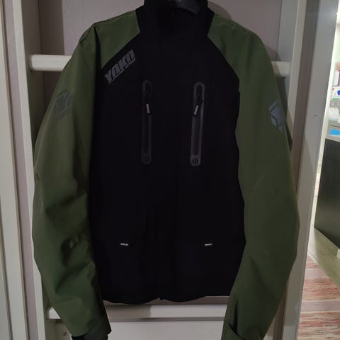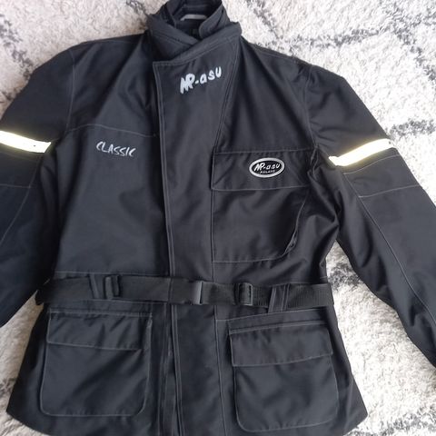 Mustavalkoinen moottoripyörätakki, jossa on useita taskuja ja säädettävät vyötärön ja hihansuiden kiristykset. Takissa on selkäpuolella heijastava kuvio turvallisuuden lisäämiseksi. Takki soveltuu moottoripyöräilyyn tarjoamalla suojaa ja mukavuutta. Kuvassa musta hopea takki on 180 cm pitkän ja 92 kg miehen päällä takki kokoa XL