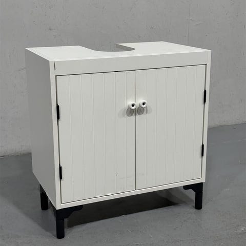 Ikean valkoinen allaskaappi, jossa kaksi ovea ja yläosassa altaalle sopiva leikkaus. Kaapissa on säilytystilaa ja se on suunniteltu kylpyhuonekäyttöön.