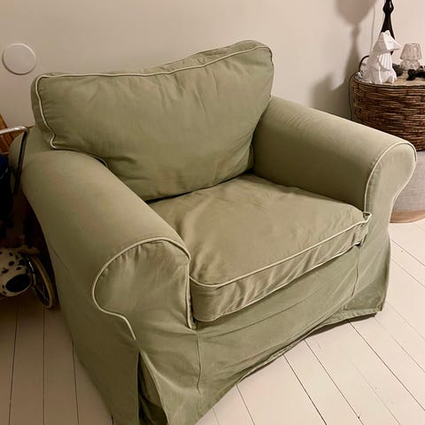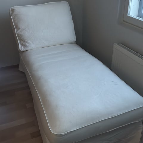 Kunto muuten hyvä mutta toisessa nojatuolin päällisessä takanurkassa helmassa ratkeama.