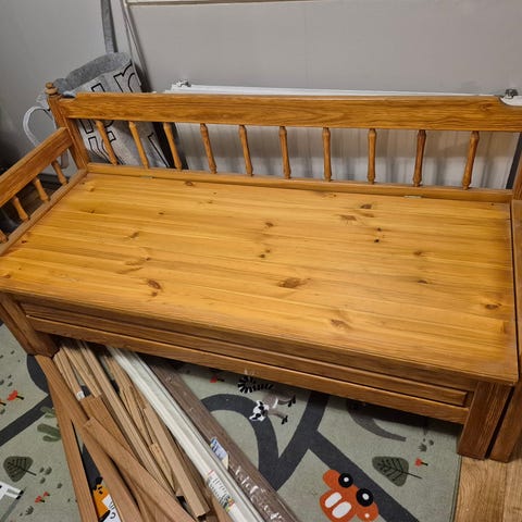 Myydään puusohva, jonka voi levittää vuodesohvaksi.