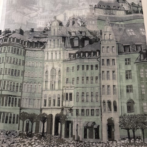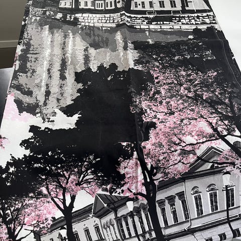Ilmeisesti Vallilan Kirkonmäki kuosilla oleva sivuverho. Tehdasmittainen. Uuden veroisessa kunnossa, on vaan kaapissa rypistynyt.