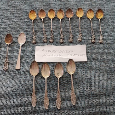 Alpakka kahvilusikoita 8kpl, sokerilusikka ja pikkuhaarukka.