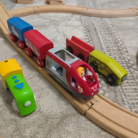 BRIO juna. Sisältää veturin ja kaksi vaunua, joissa on liikkuvat osat. Kuski sisältyy kauppaan. Kysy lisää, jos haluat kiskoja ja muita osia.