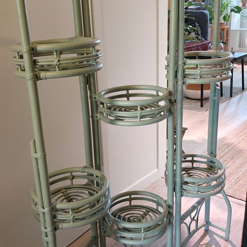 Vanha rottinkinen kukkateline / kasviteline kahdella lasitasolla.