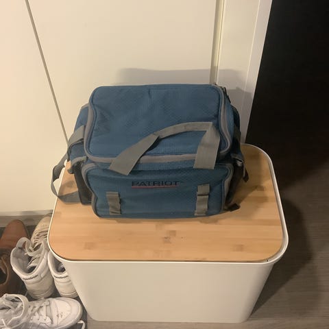 Patriot tackle system laukku ja kalapakki sisältöineen. Pakissa on mm. Siimaa, painoja, jigejä, lippuja ja koukkuja.