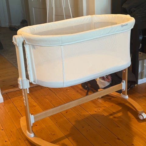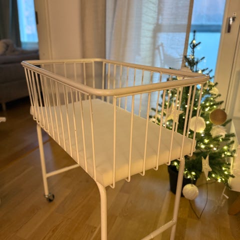 Vauvan kehto/ensisänky pyörillä.Kehdon saa halutessaan heilumaan sivusuunnassa tai pidettyä lukittuna paikoilleen. Koristeverhon saa irti. Mukaan halutessaan reunapehmuste ja patja. Koiraperhe.