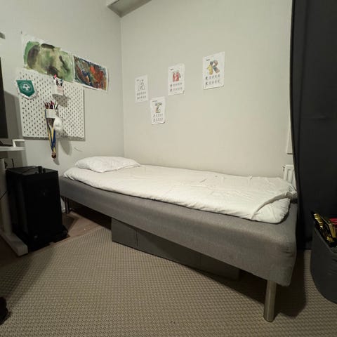 IKEA sänky vaaleanharmaalla kankaalla. Sängyn kulmassa näkyy kulumaa (kissa raapii) ja kangas on paikoin kulunut. Patja on mukana, mutta siinä on käytön jälkiä. Sänky soveltuu makuuhuoneeseen ja tarjoaa peruskäyttöön sopivan nukkumapaikan. Patja vaati pesua muuten on kunnossa.