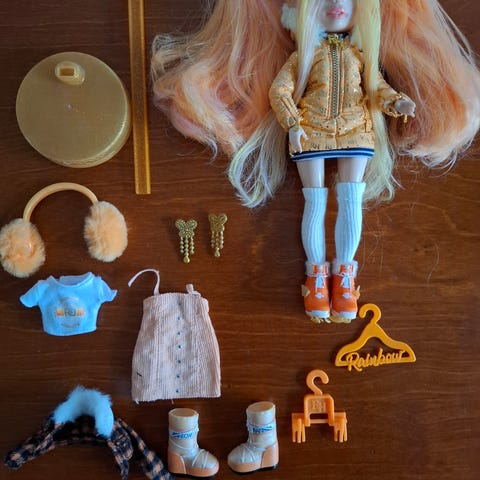 Varusteet: Mukaan tulee nuken talviasu (takki ja housut), monot sekä hienot sateenkaarikuvioiset sukset.