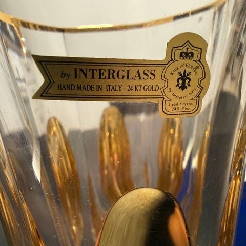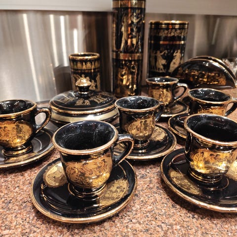 Koristeltu 24 karaatin kullalla. Musta lasitettu pinta ja klassinen antiikin Kreikan henkinen kuviointi (figuurit ja meander-ornamentit).