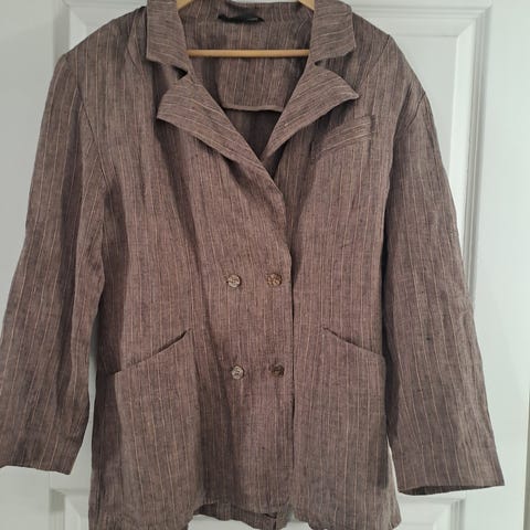 Marimekko pellavainen naisten bleiseri, koko 38, musta. Materiaalina 100 % pellava, vuori 100 % asetaatti. Klassinen raidallinen malli.