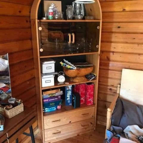 Mäntypuusta lasivitriini. Seinälle kiinnitettävä. Kulkee Sodankylään tai Rovaniemelle tarvittaessa