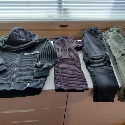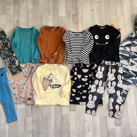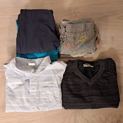 Poikien vaatepaketti koossa 92, sisältäen Jonathanin mustat verkkarit (priimakunto), 2 Lindexin ruskeaa paitaa, Name It Ryhmä Hau paidan ja Newbie housut. Housut kokoa 98, mutta ovat pituudesta niukahkoa mitoitusta. Kaikki siistejä ja ehjiä, toki päiväkodissa surutta käytettyjä. Pesty hajusteetta. Taloudessa ei eläimiä eikä tupakointia.