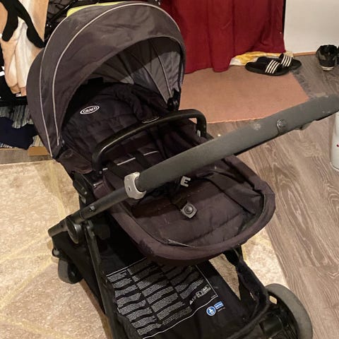 Good condition. Tires are lockable. Front tires are turning. It has seatbelt and safetybar for the baby. Comes with legmuff. Seat can be put into sleeping/sitting positions. Tires are in fine condition. Foldable.
