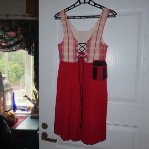 Erittäin siisti, kaunis, lähes käyttämätön kansallispuku, jossa hame, pusero, liivi ja esiliina. Lisäksi messinkikoru ja hiusnauha. Hameen pituus 71 cm ja vyötärö 90 cm.