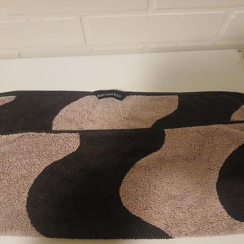 2 kappaletta. Vanhaa hyvää Marimekkoa. Isot "käsipyyhkeet. Ripustimet itse ommeltu. Hyvänä säilyneet. Kts kuvat esim pesulappu. Yhteishinta 15.