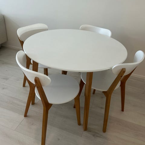 Myydään tarpeettomaksi jäänyt hyväkuntoinen, muutaman vuoden käytössä ollut tyylikäs ruokailuryhmä. Käytön jälkiä ja pieniä kolhuja on edellisestä muutosta, mutta melko huomaamattomia. Yhdestä tuolista puuttuu kaksi ruuvikiinnikettä mutta ei huomaa käytössä mitenkään (kuva).