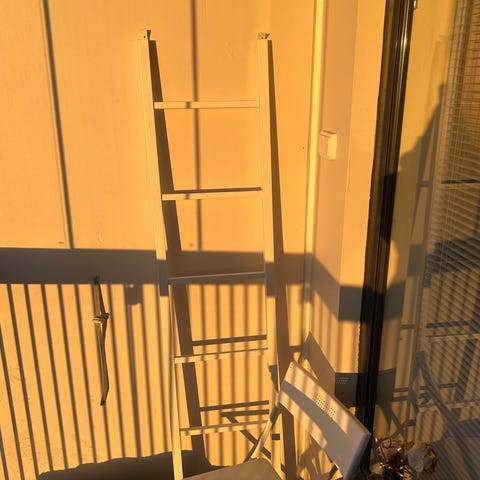 Punaiset tikkaat, jotka käyvät pieneksi hyllyksi. Leveimmillään alhaalta 52cm. Kork