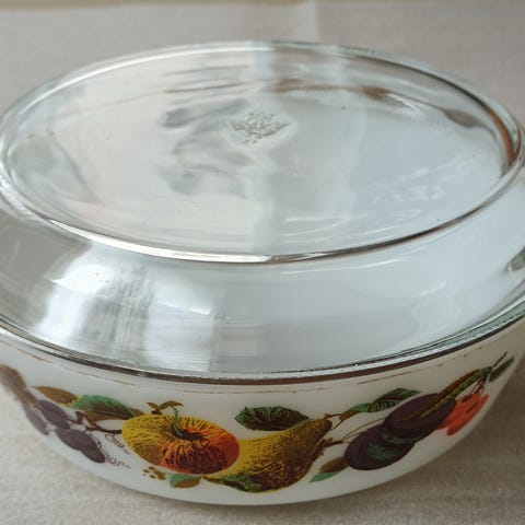 Pyrex England -uunivuoka. Erinomainen kunto. Korkeus 9 cm, halkaisija 22 cm.