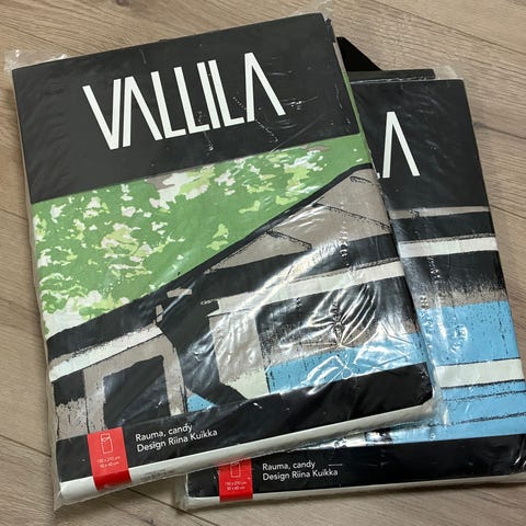 Uudet paketissaan olevat Vallilan Oulu, tomato pussilakanasetit. Pussilakana 150x210cm ja tyyny 50x60cm. 100% puuvilla.