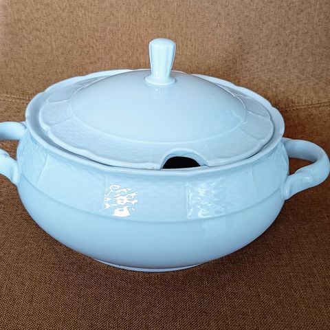 Vanhahko valkoinen keittokulho, kauhakolo, kultareunukset, niissä hiukan kulumaa.
