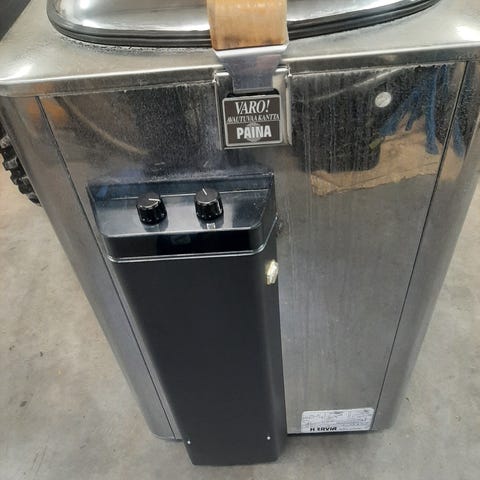 Kiuas/ kamina, joka on valmistettu teräksestä. Siinä on säädettävä kivikorotus yläosassa joka on kuvassa yläasennossa. Kiviä on kuvassa noin 30kg, eli lisää mahtuu. Muutaman kerran lämmitetty telttasaunaa. Korkeus noin 80cm korotusverkko yläasennossa ja halkaisija noin 40cm. Paino ilman kiviä ja piippua noin 25kg.
