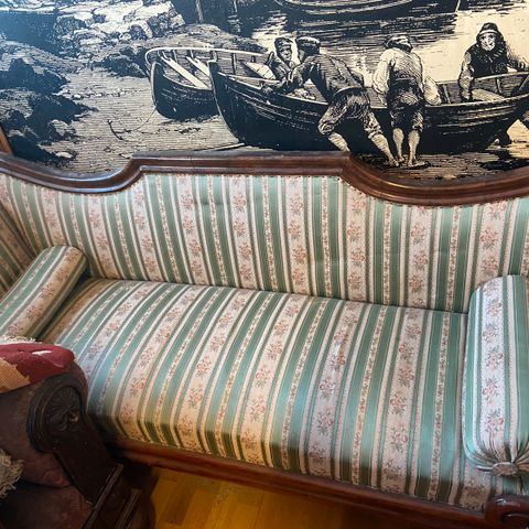 Vanha Biedermeier sohva. Ollut yhden ihmisen käytössä 50 vuotta. Täyttä puuta. Pientä kulumaa kankaassa. Ja puussa hitusen ajan patinaa. Mutta ikäänsä nähden hyväkuntoinen. Korkeutta sohvalla lattiasta selkänojan korkeimpaan kohtaan on 100 cm. Kokonaisleveys on 227 cm; istuinleveys on 160 cm. Syvyys on 62 cm. P.S. Kannattaa katsoa enemmän Googlesta Biedermeier tyylin historiasta.
