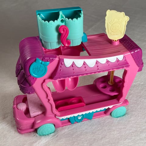 Littlest Pet Shop leluauto, mukana useita pieniä ja isompia hahmoja, ruokia ja leluosasia. Auto on väriltään pääosin pinkki ja siinä on erilaisia leikkialueita ja yksityiskohtia. Hahmot ovat pieniä ja monipuolisia, sopivat lasten leikkeihin. LPS