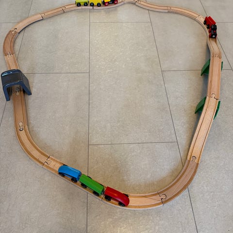 BRIO puinen junarata, joka sisältää useita radan osia ja junavaunuja. Rata on kokoonpantu lattialle ja soveltuu lasten leikkeihin. Mukana myös muutama Brio yhteen sopiva osa.