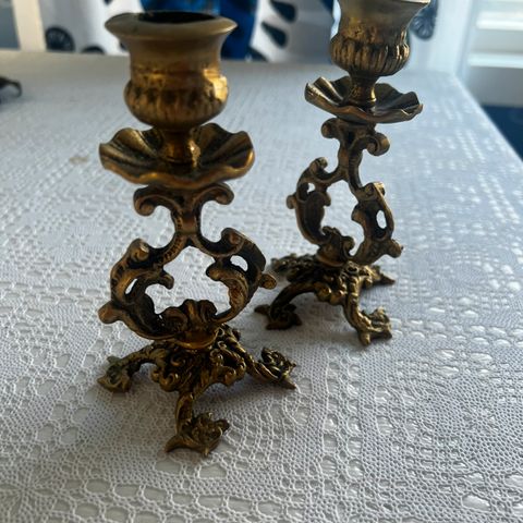 Messinkiset kynttilänjalat. Korkeus 9 cm. Nähtävissä patinaa ja käytönjälkiä. Myydään parina, 30 €.