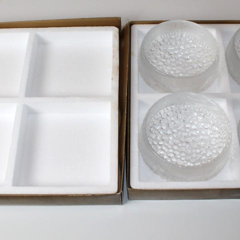 Tapio Wirkkakan suunnittelemat Milamon Triennaaliin 1968 jälkiruoka kulhot (tuote nro 2333-115) jotka tuotantoon 1970. Kulhojen läpimitta 11,5.cm ja korkeus 5 cm ovat kahdessa alkuperäispakkauksessa. Kuudessa tarrat paikallaan. Ostettu aikanaan Maxsista. Nouto tai postitus.