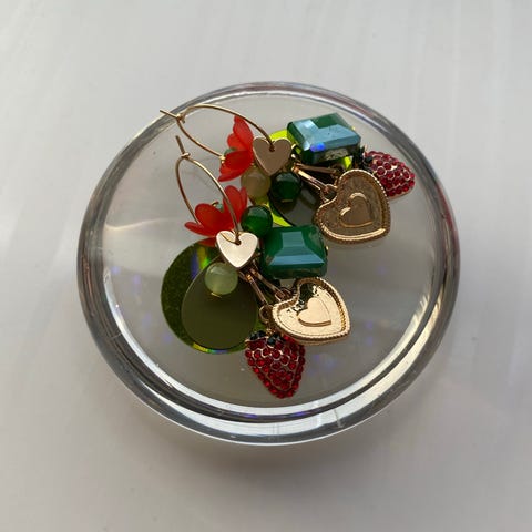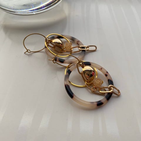 Korvakorut ovat uudet ja käyttämättömät. Korvakorurenkast kullattu teräs, riipus korumetalli, lasi, paljetti, valkoinen/sininen/kulta/kirkas.
