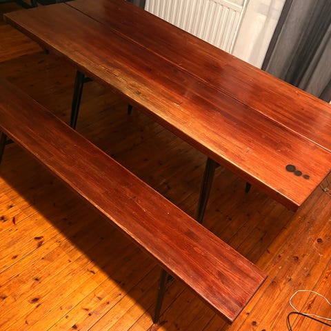 Tuoleissa on havaittavissa kulumaa ja naarmuja pinnoilla, erityisesti jaloissa ja istuinosassa. Pöydässä kuluma pinnoitteessa (haalistuma) sekä käytön jälkiä tasossa. Runkoehjä kokonaisuus, joka kaipaisi hieman rakkautta.