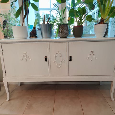 Elämää nähnyt 50-60-luvun senkki, josta näppärä fiksaa nätin. Pinta kulunut. Laatikot auki, avainta ei ole.