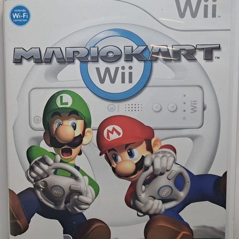 Ajopelien klassikko, Mario Kart Wii + kaksi rattia (vaativat erilliset ohjaimet). 50 euroa.
