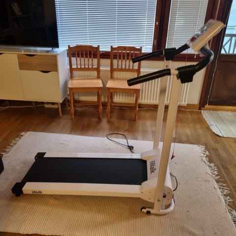 iWalk juoksumatto, jossa on ohjauspaneeli ja käsikahvat. Käytönjälkiä on, mutta kuitenkin hyvässä kunnossa ja toimii edelleen. Turvanaruna on lahjanarua, mutta tekee tehtävänsä ja pysäyttää maton jos turvanarua vetää. Juoksumaton saa pystyasentoon, joten sen saa helposti pois tieltä.