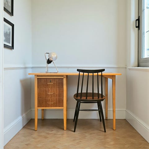 Kokopuinen kirjoituspöytä, metallijalat. Kannessa yksi näkyvä pyöreä jälki, pari haaleampaa vieressä. Viisi vetokaatikkoa.
