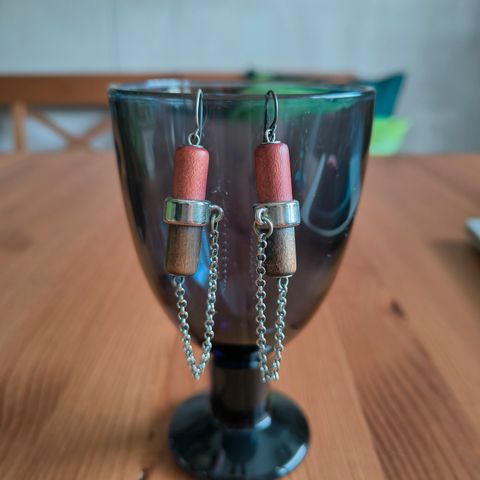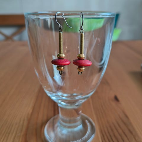 Aarikan retro korvakorut. Puuosan väri puhdas punainen. Renkaan halkaisija n. 3 cm.