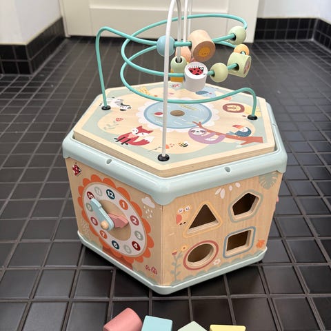 Kuvan mukainen lelu vauvalle/taaperolle. Joka sivustalla erilainen maatila-aiheinen aktiviteetti.