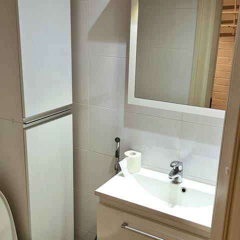 Grohe pesuallas valkoisella altaalla ja mustalla allaskaapilla. Altaassa on hana, joka on valmistettu kromatusta materiaalista. Altaassa näkyy pieni halkeama. Peilikaappi on kolmilasinen. Tuote soveltuu kylpyhuoneen tai vessan kalusteeksi.