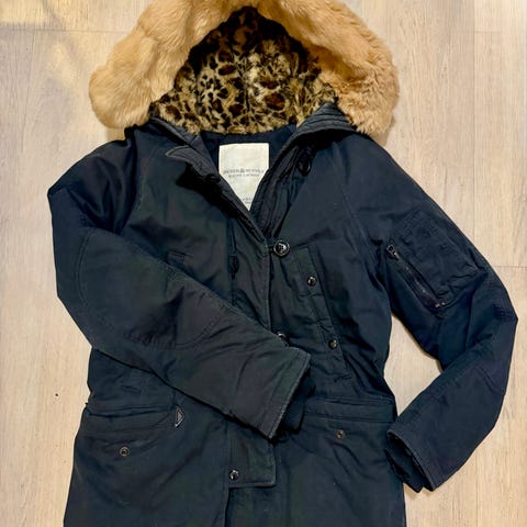 Perussiisti lyhyen mallinen untuvatakki. Hupun nyörin toisesta päästä puuttuu kiristin ja samoin vyötärön sisäpuolella olevan nauhan päästä. Ei vaikuta kyllä käyttöön. Vastaa kokoaan.