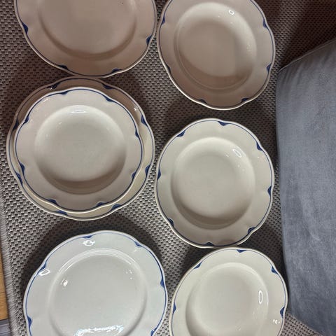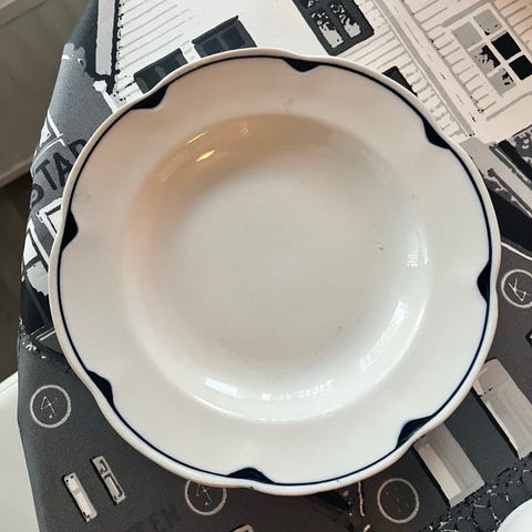 Arabia Pekka lautanen, valkoinen posliini, sinisellä reunakoristeella. Lautasen halkaisija 20 cm. Pientä naarmua pinnassa. Myös nouto Espoosta.