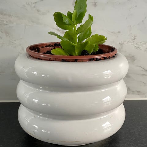 Vihreä punottu kori, halkaisija noin 20 cm, ja kaksi pikkuruukkua.
