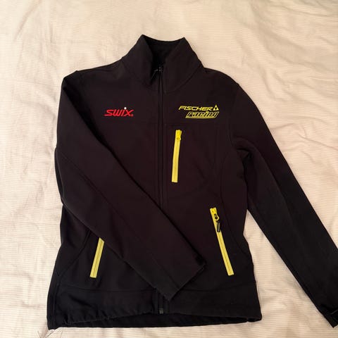 Musta kevyt hiihtotakki / verryttelytakki / juoksutakki / urheilutakki. Moitteeton kunto. Vetoketjullinen rintatasku. Helmassa kiristysnauhat. Heijastimia edessä, takana ja hihoissa. Säilytyksestä hieman ryppyinen. Kissatalous.
