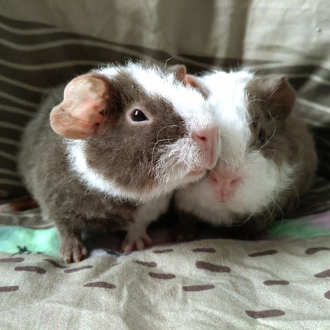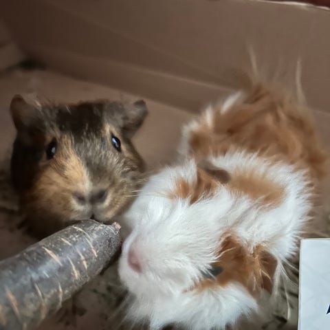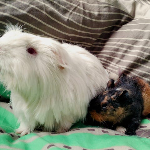 Toinen on alle vuoden ikäinen teddy, todella kiltti ja helposti hoidettava. Kaveriksi kohta luovutusikään tuleva poikanen, vaalea punasilmäinen hiukan kiharakarvainen uros. Isänä poikasella skinny-marsu, joten karva on hiukan harvaa ja saattaa osittain pudota kasvun myötä.