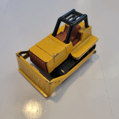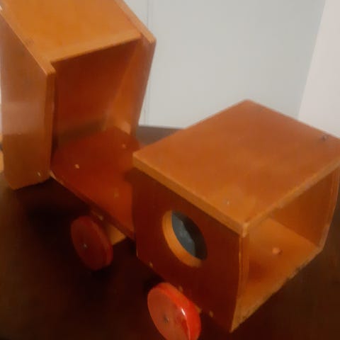 Puinen leikkiauto, maalattu vihreäksi. Leikkiauto koostuu useista osista ja siinä on pyörät liikkuvuutta varten. Sopii lasten leikkeihin.