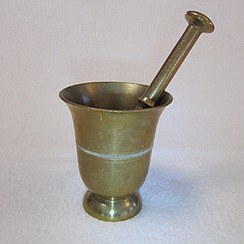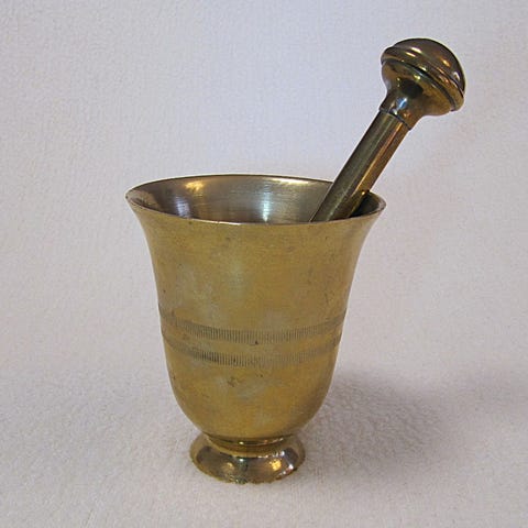 Vanha messinkinen mortteli, korkeus n. 11,6 cm, survinpulikan pituus n. 22,8 cm. Pakettiautomaattilähetys Manner-Suomeen 10,90 euroa, josta saa lähetyksen seurantanumeron. Nouto Kuopiosta keskustasta. En käytä ToriDiiliä.