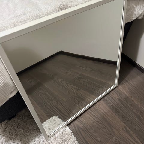 IKEA peili valkoisella kehyksellä. Peilin runko on valmistettu puumateriaalista ja siinä on koristeellinen kehys. Peili on seinälle ripustettava ja sopii erilaisiin tiloihin, kuten eteiseen tai makuuhuoneeseen.